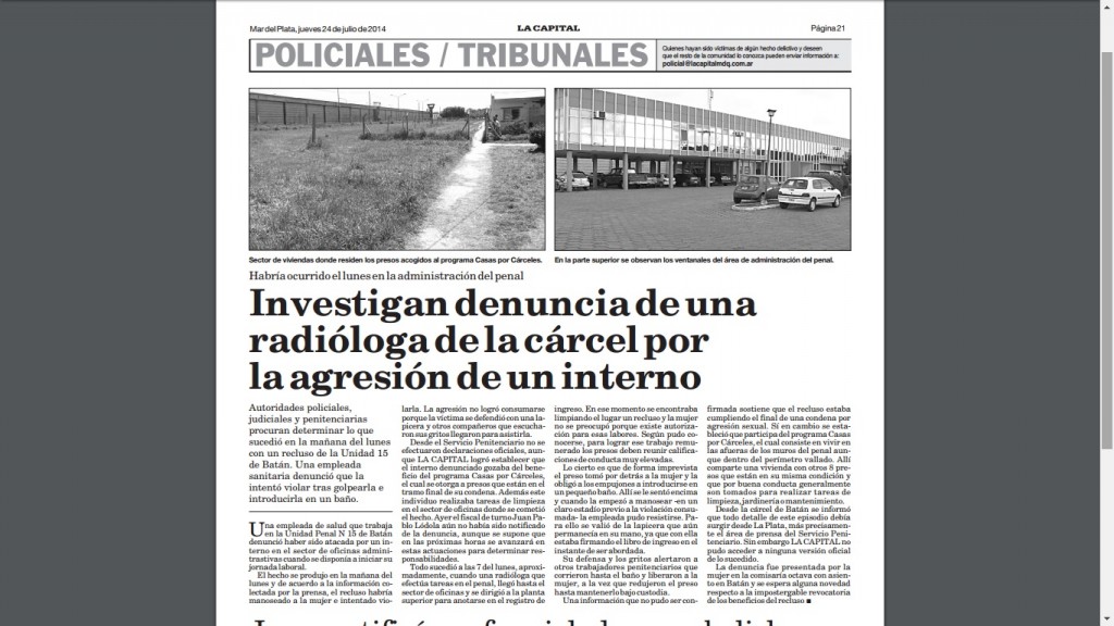 En julio de 2014 un interno que realizaba tareas de limpieza en el sector administrativo de la cárcel atacó a una radióloga e intentó manosearla. El autor de la agresión sexual fue Rubén César Galera, el detenido hoy por la violación en Playa Los Lobos.