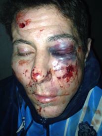 Imagen de uno de los hinchas de Peñarol golpeado por la policía en Bahía Blanca.