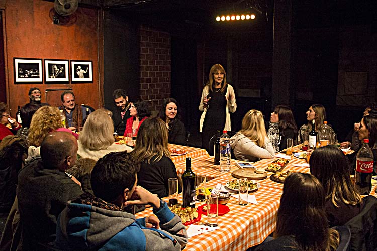 Dejando de lado la noción clásica de lo “teatral”, con la premisa de compartir una reunión entre amigos, la presencia de la bebida y la comida es fundamental en el espectáculo, generando una comunión entre todos los presentes. La reunión social para representar la obra teatral es también una reunión de personajes y espectadores sin división escénica.