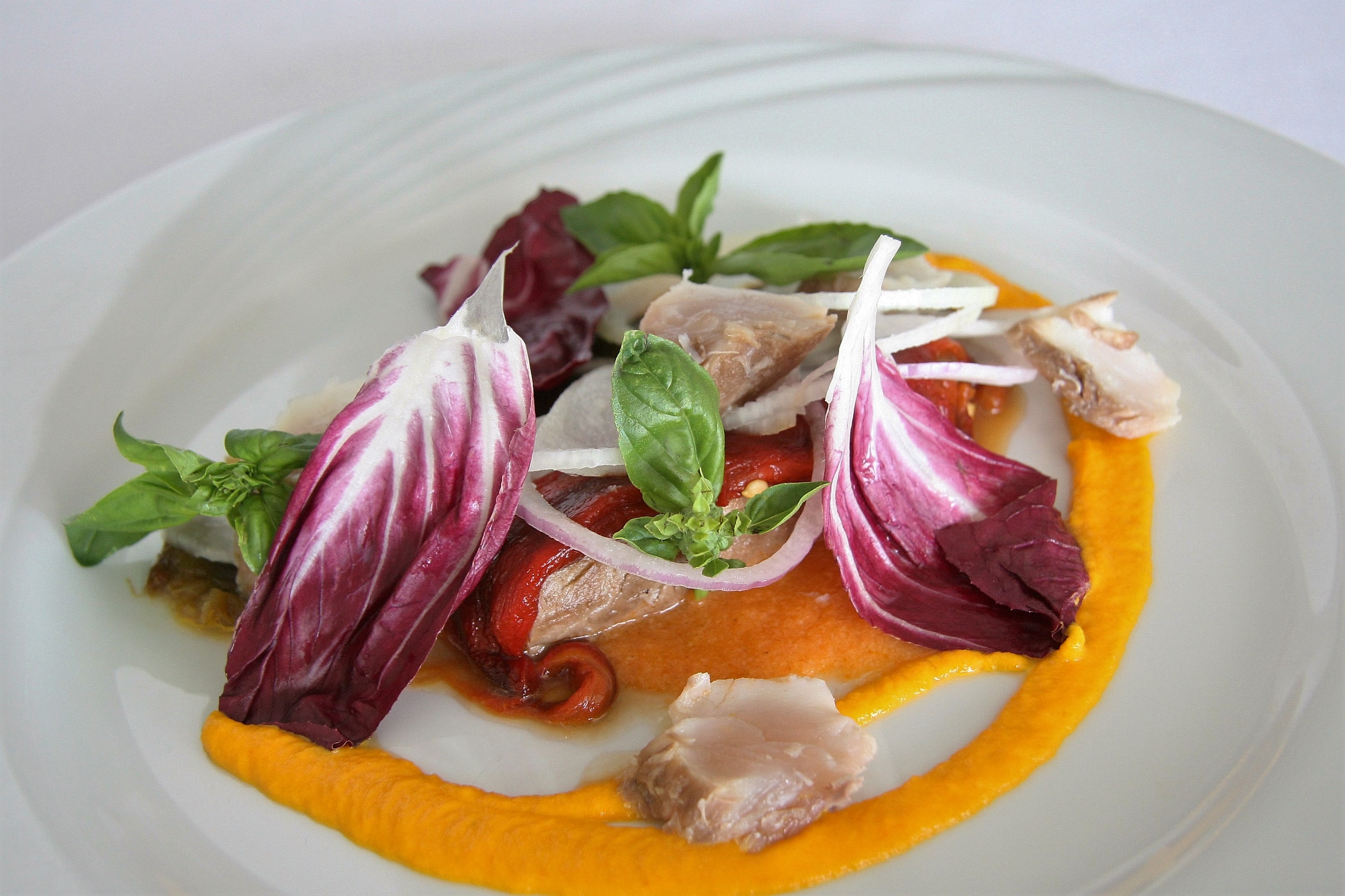 Para presentar en el plato, disponer la porción de bonito confitado, condimentar con sal y pimienta a gusto y disponer el morrón asado y los aros de cebolla y las hojas verdes que más les gusten. En la imagen, con unas hojas de albahaca, radicchio y decoradas con zanahoria.