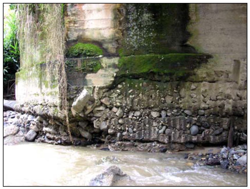 Socavación : “Se conoce como a la erosión causada por el agua o por materiales abrasivos transportados por una corriente, la cual genera desgaste del hormigón y fallas de estabilidad. Es típica de los estribos, pilas y cimentaciones”.