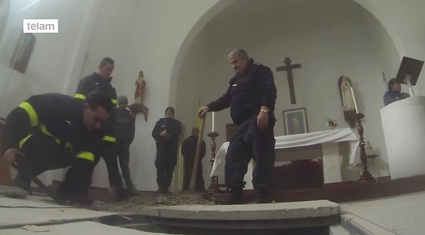 La noticia del hallazgo había sido anticipado anoche en América TV, donde agregaron que las bóvedas estaban debajo del altar, tapadas por una alfombra roja que fue levantada por efectivos policiales. Ese canal emitió las imágenes de hallazgo.