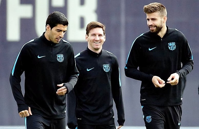 Messi junto a Luis Suárez y Gerard Piqué en el entrenamiento de hoy. Foto: EFE.