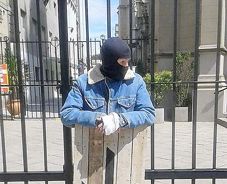 El “Rusito” también estuvo presente en los enfrentamientos que se produjeron frente a la Catedral durante la marcha de las mujeres. Poco antes de los incidentes había sido demorado por la policía frente a la Iglesia: encapuchado y con símbolos nazis agredía a mujeres.