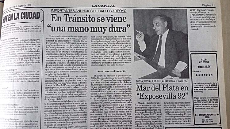 El jueves 5 de marzo de 1992, Carlos Arroyo anticipaba el regreso de la “mano dura” en el control del tránsito de Mar del Plata. Así, el funcionario, que ya había integrado el municipio en los últimos años de la década del setenta, enriquecía su fama de riguroso custodio de las leyes de tránsito. Esa misma que, junto con sus 25 años como director de escuela, lo catapultaron a la intendencia.