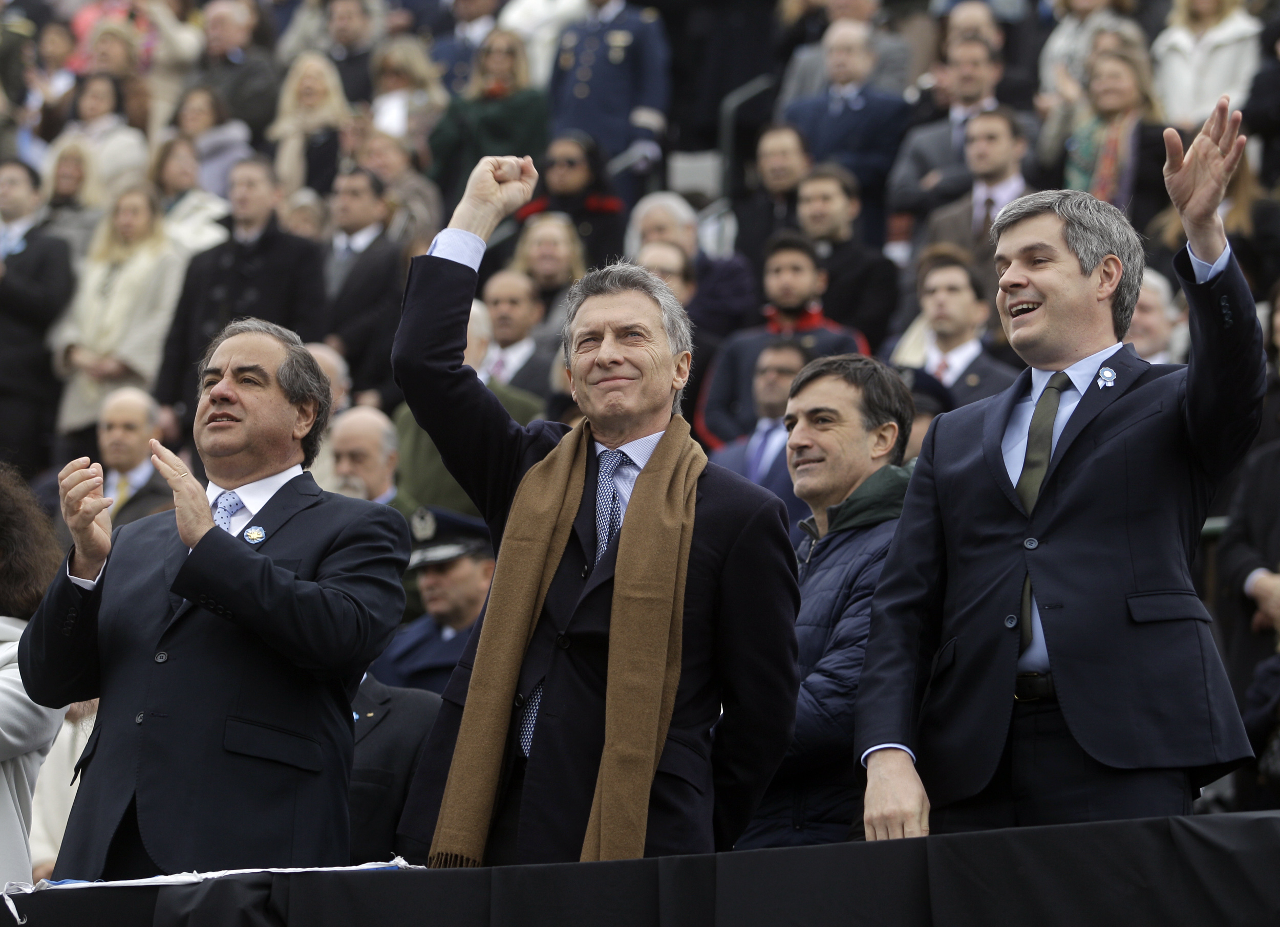 El Presidente, que estuvo acompañado en el palco de autoridades por el jefe de Gabinete, Marcos Peña, y el ministro de Defensa, Julio Martínez, había anunciado a la mañana por la red social twitter que por el cansancio acumulado en sus últimos viajes no iba a estar presente en el acto, pero luego cambió de decisión y estuvo.