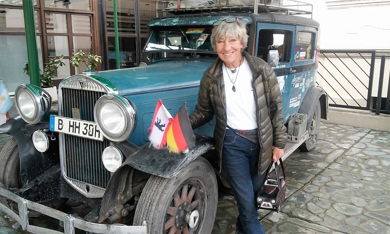 Heidi Hetzer llegó en su auto modelo 1930. Una apasionada de los autos arribó al Museo Fangio. Pasó por Turquía, Irán, Mongolia, Singapur, Australia y Nueva Zelanda.