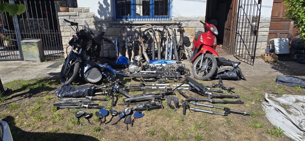Entre los elementos incautados había motores, chasis, horquillas, tambores de ignición, espejos, tanques de combustible y caños de escape, así como dos teléfonos celulares y una balanza de precisión.