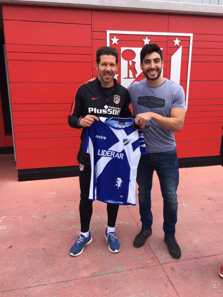 Facundo Moyano, el hombre fuerte de Alvarado de Mar del Plata, se encontró con Diego Simeone, el técnico del momento y le obsequió una camiseta del club marplatense.