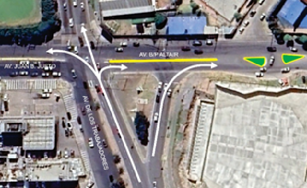 Quienes transiten por Avenida de los Trabajadores en sentido al norte tendrán opción de giro a la izquierda hacia Avenida Juan B. Justo, continuar recto por Avenida Patricio Peralta Ramos o doblar a la derecha, tanto en la intersección con B/P Altair como por la colectora que deriva en esta misma arteria.
