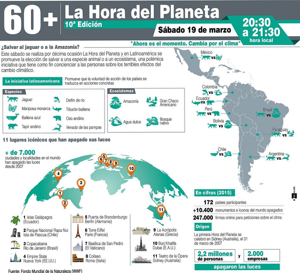 En 2015, La Hora del Planeta se expandió por el mundo con 10 mil ciudades de 172 países que participaron de la iniciativa apagando monumentos emblemáticos como el Sky Tower (Nueva Zelanda), la Torre Eiffel (Francia), el Obelisco (Argentina), Times Square (Nueva York), y el Palacio Real de Madrid (España), entre otros.