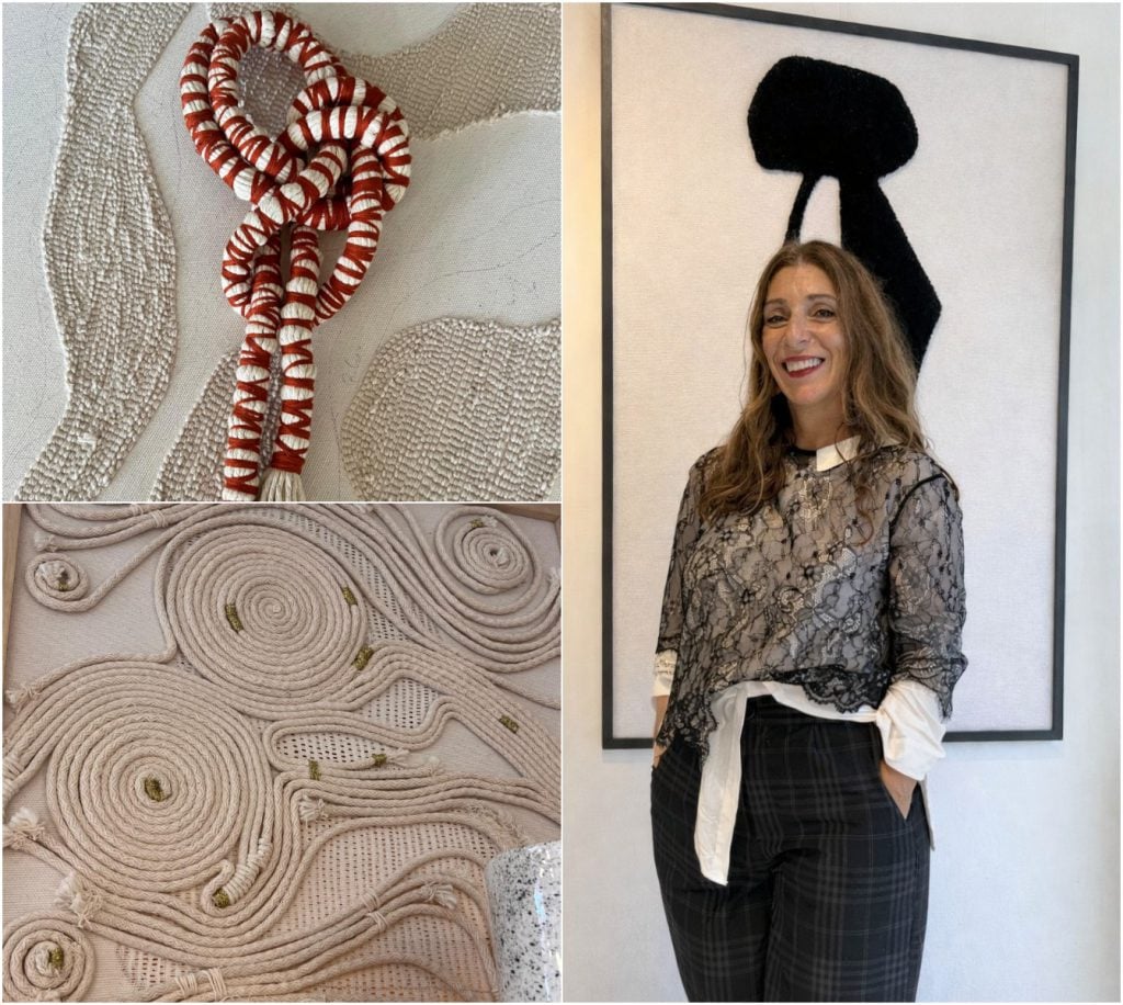 La muestra reúne trabajos realizados con diversas técnicas: encordados de kraft, mezclas de materiales, tramas orgánicas y estructuradas. También incluye tufting en relieve, bordado y objetos textiles tridimensionales.
