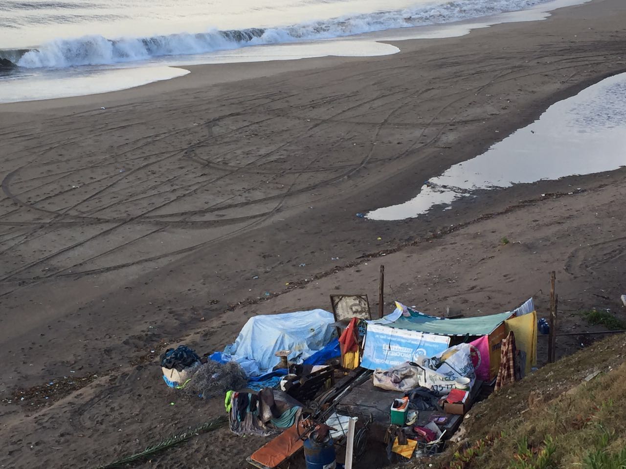 Ni el frio ni la lluvia parece acobardarlos. Se trata de un grupo de personas que desde hace varias semanas ocupa un pequeño sector de una playa del norte de Mar del Plata, refugiándose dentro de un precaria construcción hecha con lonas, trapos y cartones.