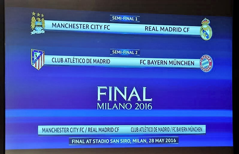 Manchester City-Real Madrid y Atlético de Madrid-Bayern Munich serán las semifinales de la Liga de Campeones, según determinó el sorteo que tuvo lugar este viernes, en la sede de la UEFA en Nyon.