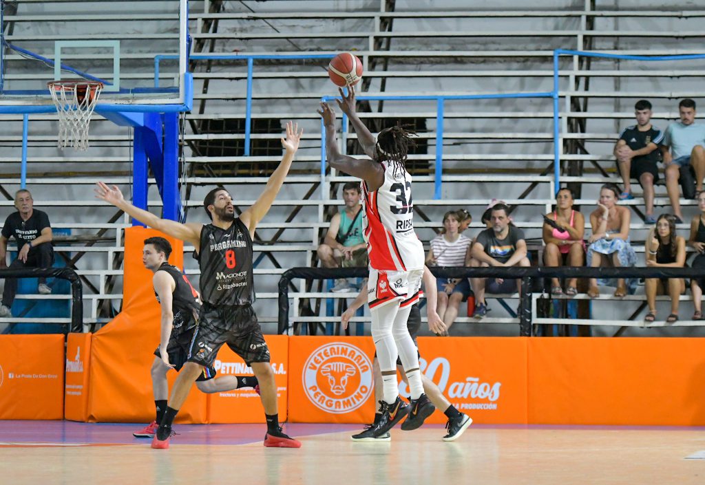 Foto: Prensa Pergamino Básquet. Tirrell Brown toma un lanzamiento de 5 metros frente a la defensa de Matías Núñez.