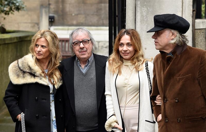 Bill Wyman y Bob Geldof (con gorra) junto a sus esposas en el casamiento de Rupert Murdoch. Foto: EFE.