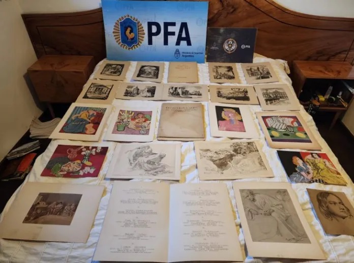 Tras el allanamiento, que se extendió por al menos tres horas, los policías secuestraron más de 25 estampas de colecciones alemanas y francesas de la década de 1940, dos teléfonos celulares, documentos de interés y armas de fuego: un revólver y una escopeta.