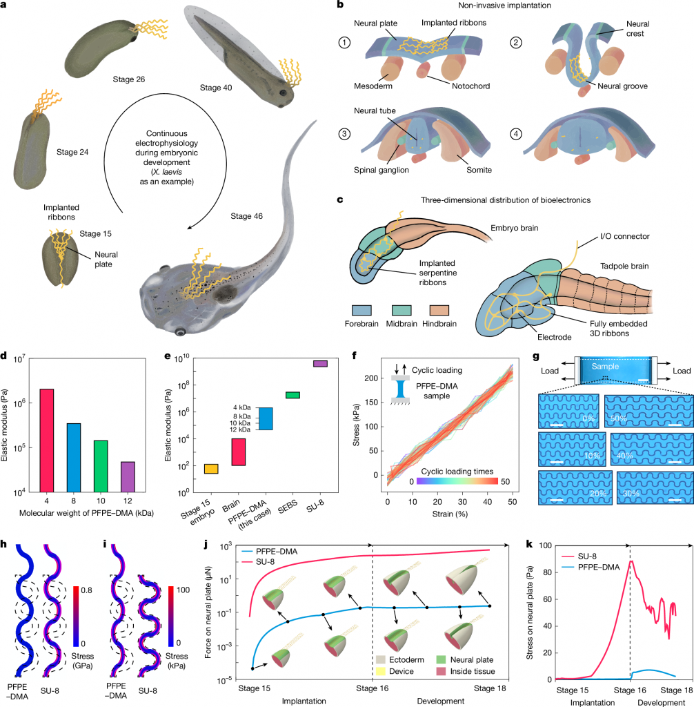 Un dispositivo bioelectrónico blando, fino y elástico fue implantado en el futuro cerebro de embriones de renacuajo, donde se integra a medida que ese órgano se desarrolla. Un paso que, en un futuro, podría facilitar comprender y tratar enfermedades que se manifiestan en las primeras etapas del desarrollo.