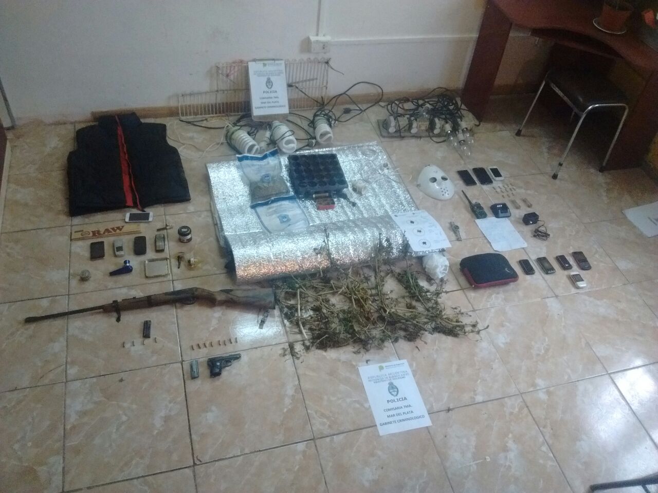 Conforme trascendió, en el domicilio había una carabina calibre 22 cargada, cinco teléfonos celulares y marihuana en distintas formas (un kilo de semillas, 200 gramos de sustancia picada y varios plantines). Además, se encontraron pipas para fumar y diez lámparas que conformaban un sistema casero de secado utilizado para la última etapa del cultivo.
