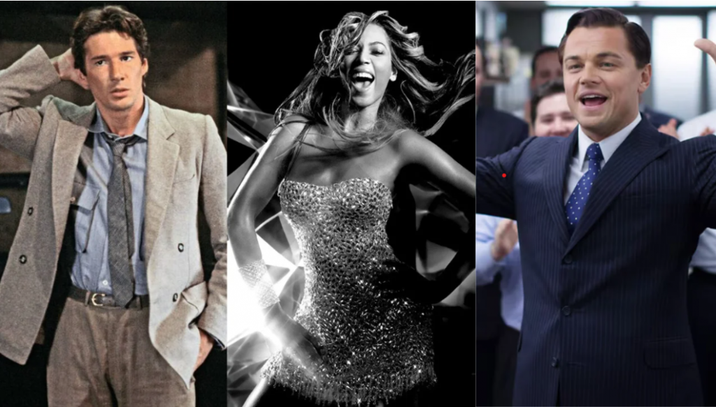 Richard Gere lució una emblemática chaqueta Armani color gris claro durante el rodaje de American Gigoló en 1982, así como Leonardo DiCaprio hizo lo propio en El Lobo de Wall Street con refinados trajes que representaron la codicia del protagonista en 2013.