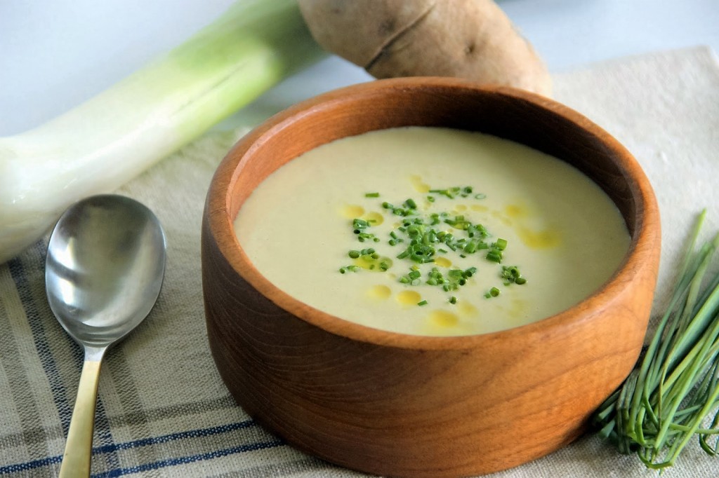 La crema caliente de puerros y papas era ya un clásico de la cocina regional francesa cuando el chef del Ritz-Carlton de Nueva York, Louis Diat, ideó, por viejos recuerdos infantiles, alargarla con leche fría, mejor con crema fría, y convertirla en una delicia veraniega. Pasó la receta a su hermano Lucien, también chef de un gran hotel, pero en París: el Plaza-Athenée.