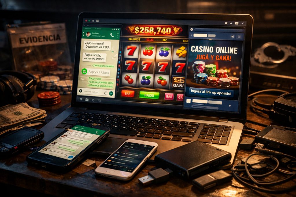 Durante los registros domiciliarios efectuados en el sudoeste de la ciudad este jueves, los efectivos procedieron al secuestro de dispositivos electrónicos, teléfonos y computadoras. Estos elementos serán sometidos a pericias informáticas y análisis de UFED para confirmar la distribución de roles en la organización y administración de las apuestas por fuera de la regulación estatal.