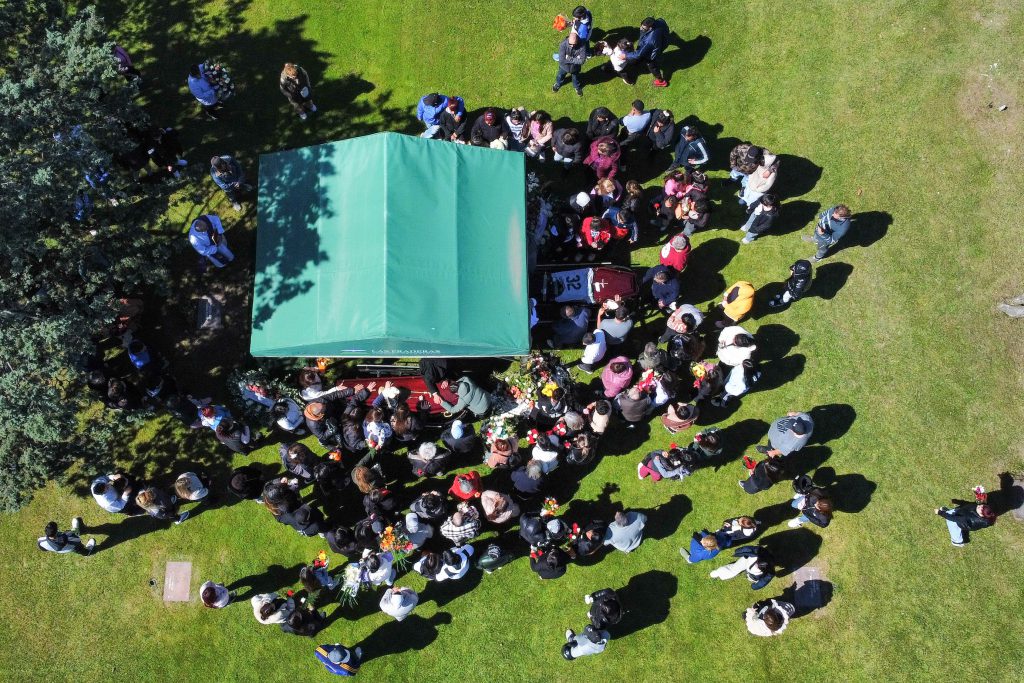 Imagen aérea que muestra personas asistiendo al funeral de Brenda del Castillo y Morena Verdi, víctimas de feminicidio, en el cementerio Las Praderas. Foto: EFE | Adan González.