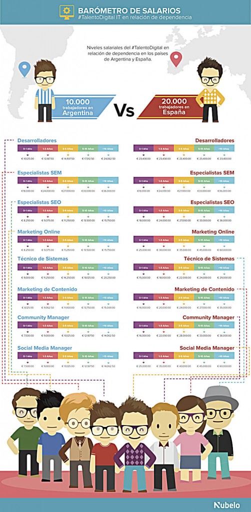 En tanto, en el país los puestos tecnológicos mejor retribuidos son los especialistas SEM y los técnicos de sistemas, que van desde los 9 mil euros con un año de experiencia a 36 mil euros; mientras que en España, los puestos tecnológicos mejor pagos son los de Social Media Manager y los Online Marketing Manager, que van desde los 25 mil euros anuales al inicio hasta los 60 mil euros a medida que la persona adquiere antigüedad laboral. A ellos les siguen los expertos en Magento, .NET y Java.