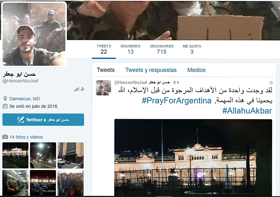 Dos jóvenes de 21 años que a través de la cuenta de twitter @HassanAbuJaaf difundieron mensajes en árabe donde mencionaron el Presidente Mauricio Macri bajo el hashtag “Pray for Argentina” fueron detenidos en la madrugada de hoy, en un domicilio del barrio de Chacarita, en la calle Plaza al 800, por difundir a través de la red social “mensajes amenazantes” con consignas de aparente índole terroristas islámica.