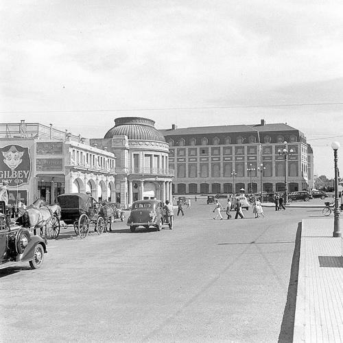 El Casino Central fue inaugurado en 1939 y durante algún tiempo coexistieron la nueva obra y lo poco que quedaba de la vieja rambla. Así lo acredita esta foto tomada por Hart Preston, quien fue enviado especialmente por la Revista Life para graficar el verano marplatense. La imagen captura los “Mateos” que seguían circulando por la ciudad y la plataforma central sobre la calle para posibilitar el acceso a los tranvías.