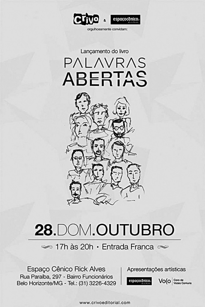 -Los editores Lucas y Rodrigo tenían un proyecto de publicar una antología con diversos escritores/autores nuevos (inclusive ellos mismos), en su gran mayoría, personas de Belo Horizonte. Conversábamos sobre eso desde el 2010, si no me falla la memoria. El hecho fue que en 2011 decidimos invitar a algunas personas que sabíamos que escribían y resolvimos reunirnos para conversar sobre la producción del libro, pero no sabíamos aún cómo hacerlo. Entonces, Lucas y Rodrigo invitaron para la primera reunión a Raphael Felício (diseñador), Vanessa Souza (ilustradora) y Haley Caldas (amigo y que sabíamos que iría a involucrarse en el proyecto). En dicha reunión, decidimos la cantidad de poemas por autor, además de definir la ilustradora y el diseñador. Hete aquí que surge la gran cuestión: “¿Cuál sería la editorial?” Discutimos la posibilidad de hacer el libro sin ninguna o contratar alguna. Pero la cuestión nos envolvió y nos preguntamos “¿Por qué no crear una editorial?”. Investigamos lo que tendríamos que hacer (registrar la empresa y otros trámites burocráticos) y concordamos en que sería mejor crear nuestra propia editorial. De esta manera, la Crivo Editorial surgió de la intención de publicar nuevos autores y sobre todo, nació del libro: “Palavras Abertas” (Palabras Abiertas).