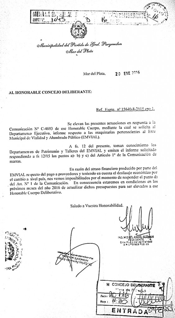 El documento que ayer circulaba entre los concejales forma parte de una respuesta a un pedido de informes, por el cual se solicitó la elaboración de un listado de los bienes existentes en el Emvial, junto a una descripción de su estado.