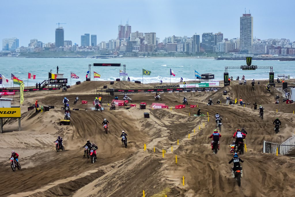 Imponente imagen con las motos lanzadas a toda velocidad sobre la arena y al fondo, el mar y la silueta de Mar del Plata.
