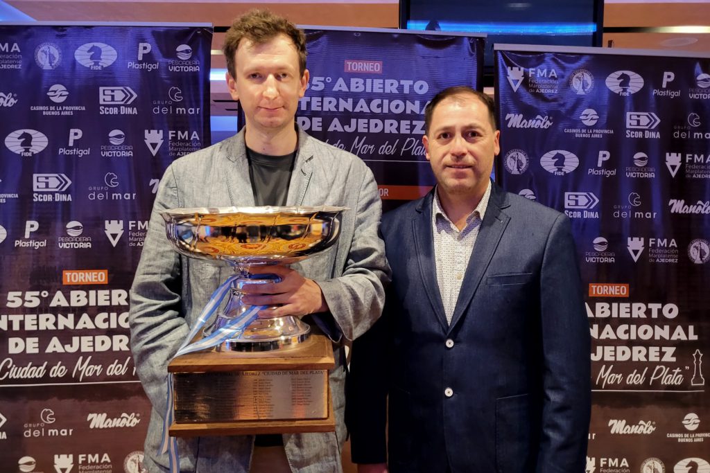 Javier Curilen, presidente de la Federación Marplatense de Ajedrez, hizo entrega de la copa al campeón, el GM Vitalii Kiselev.