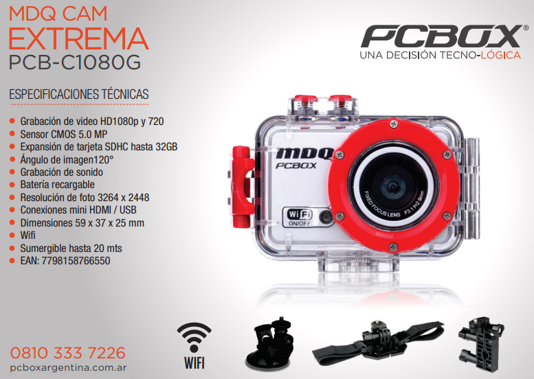 Con grabación de video HD1080p y 720; sensor CMOS 5.0 MP; expansión de tarjeta SDHC hasta 32GB; ángulo de imagen 120°; grabación de sonido; batería recargable; resolución de foto 3264 x 2448; conexiones mini HDMI / USB; dimensiones 59 x 37 x 25 mm; wifi y sumergible hasta 20 mts.