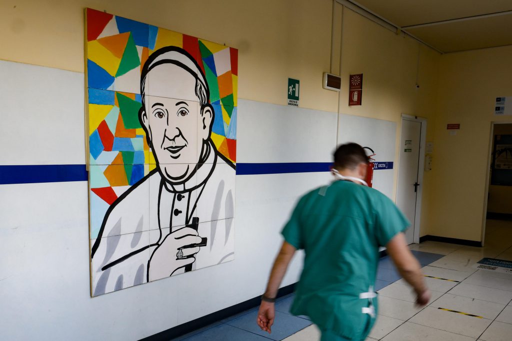Un médico camina junto a un mural que representa al Papa Francisco en el interior del Hospital Gemelli. Foto: EFE | EPA | Fabio Frustaci.
