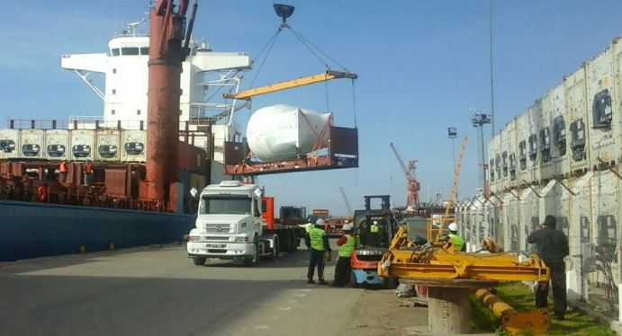 Se trata de tanques para la fábrica que Antares está siendo instalada en el Parque Industrial. La descarga de los equipos se realizó en la Terminal de Contenedores 2 del puerto local, que progresivamente está incrementando su actividad.