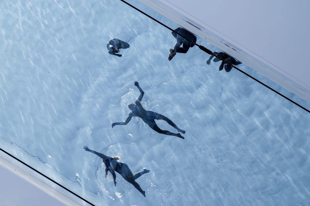Personas nadando en la Sky Pool, una pileta de 25 metros de largo suspendida a 35 metros del suelo que actúa como puente entre dos edificios residenciales en Embassy Gardens, Londres. Foto: EFE | Tolga Akmen.
