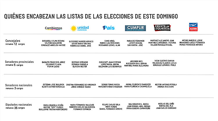 En el caso de la categoría de senadores, la lista de Cambiemos la encabeza Esteban Bullrich, la de Unidad Ciudadana la ex presidenta Cristina Fernández de Kirchner, la de 1País Sergio Massa, la del Frente Justicialista Cumplir Florencio Randazzo y la del Frente de Izquierda Néstor Pitrola.