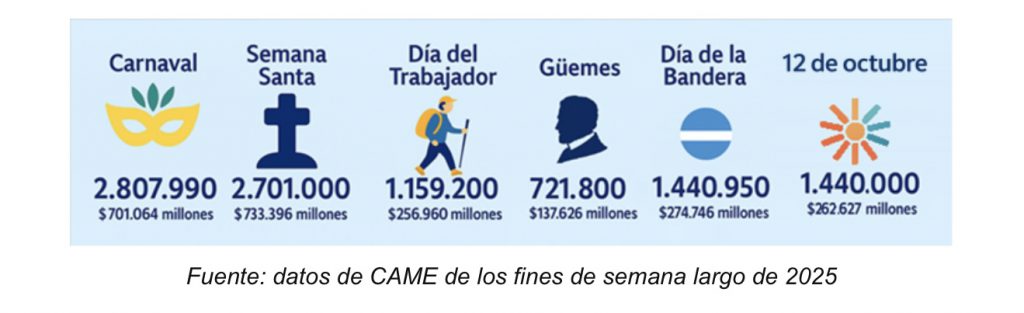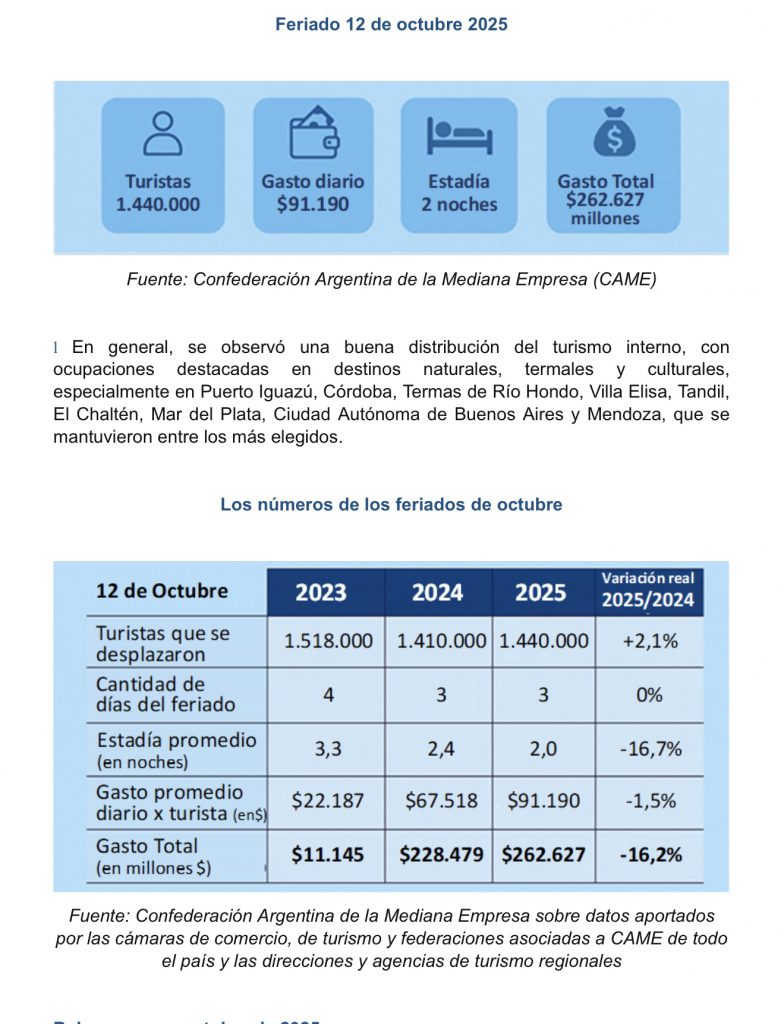 Ajenos a todas estas polémicas, miles de visitantes disfrutaron el fin de semana largo en Mar del Plata, mientras otros miles de jóvenes comenzaban a arribar a la ciudad para participar de las finales de los torneos Juveniles Bonaerenses. Sin embargo, el feriado del Día del Respeto a la Diversidad Cultural volvió a poner en marcha al país, aunque a ritmo corto. Hubo más turistas que el año pasado, pero con estadías más breves, bolsillos ajustados y consumos medidos. Según la UCIP, comparando la misma fecha del año anterior, la caída en las ventas comerciales fue del 8 por ciento. Según la Confederación Argentina de la Mediana Empresa (CAME), viajaron 1,44 millones de turistas por todo el país, un 2,1% más que en 2024. Pero el promedio de permanencia cayó a dos noches, contra las 2,4 del año pasado. Más movimiento, menos gasto. La frase condensa el pulso de la economía argentina en este tramo del año: la necesidad de escapar un rato del trajín cotidiano, aunque sea recortando días y presupuesto. El gasto promedio diario fue de $91.190 por persona, con una leve baja en términos reales, y el gasto total ascendió a $262.627 millones, un 16% menos medido en poder adquisitivo.