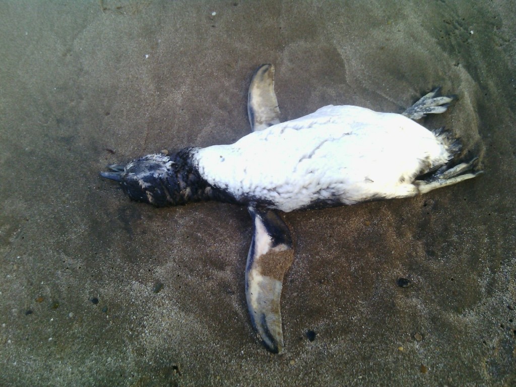 imagen: un pingüino muerto sobre la costa. Pero no sólo eso: también aparecieron cada cincuentra metros.