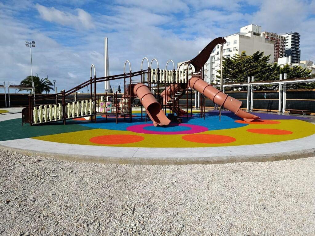 El dino vigila la plaza mientras el aroma a pizza recién salida del horno se mezcla con la brisa marina. Un detalle que convierte cada visita en un momento especial.