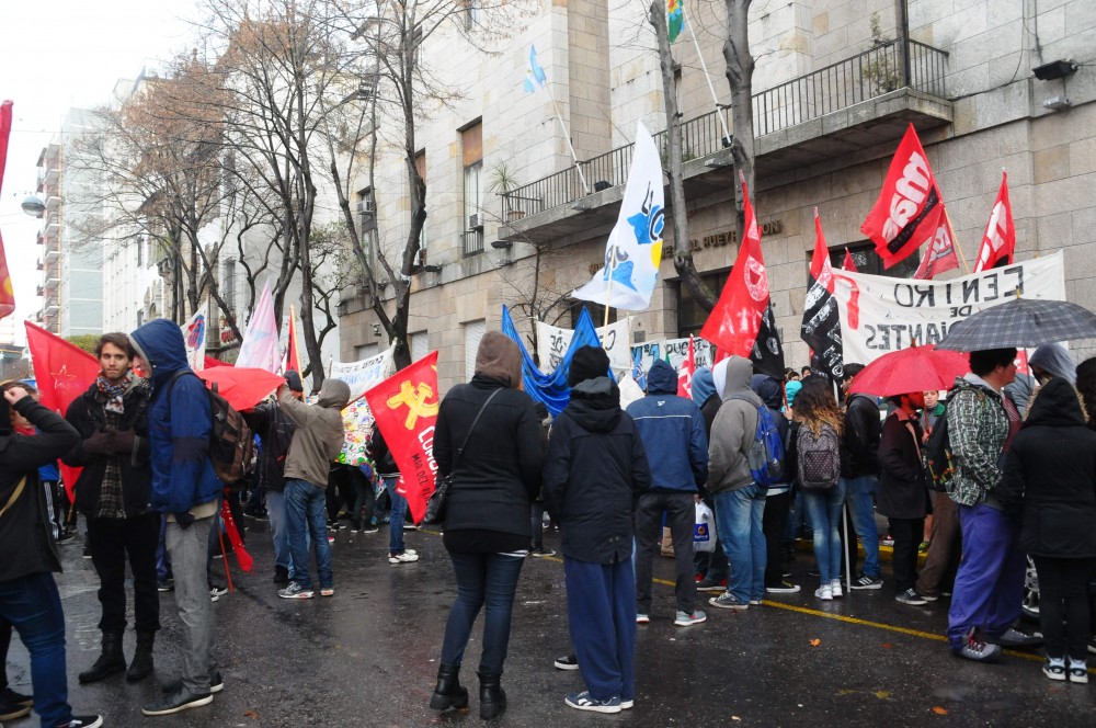 Cientos de alumnos de escuelas secundarias junto a docentes se concentraron frente a los edificios del Casino y del NH Gran Hotel Provincial para luego caminar bajo la lluvia por las calles céntricas rumbo a la esquina de Luro e Hipólito Yrigoyen.