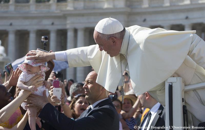 Francisco saludando a un niño durante la audiencia general celebrada en la Plaza de San Pedro. Foto: EFE / L'Osservatore Romano.