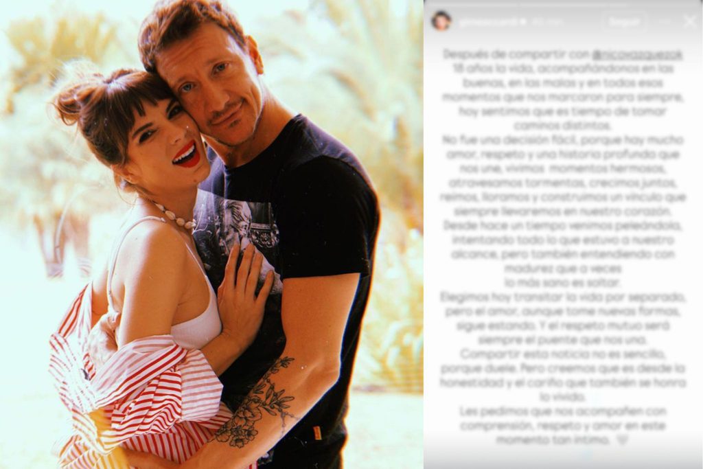 Los actores Gimena Accardi y Nicolás Vázquez hicieron pública su separación este martes mediante un extenso comunicado en sus redes sociales. “Después de compartir con @nicovazquezok 18 años la vida, acompañándonos en las buenas, en las malas y en todos esos momentos que nos marcaron para siempre, hoy sentimos que es tiempo de tomar caminos distintos“, escribieron.