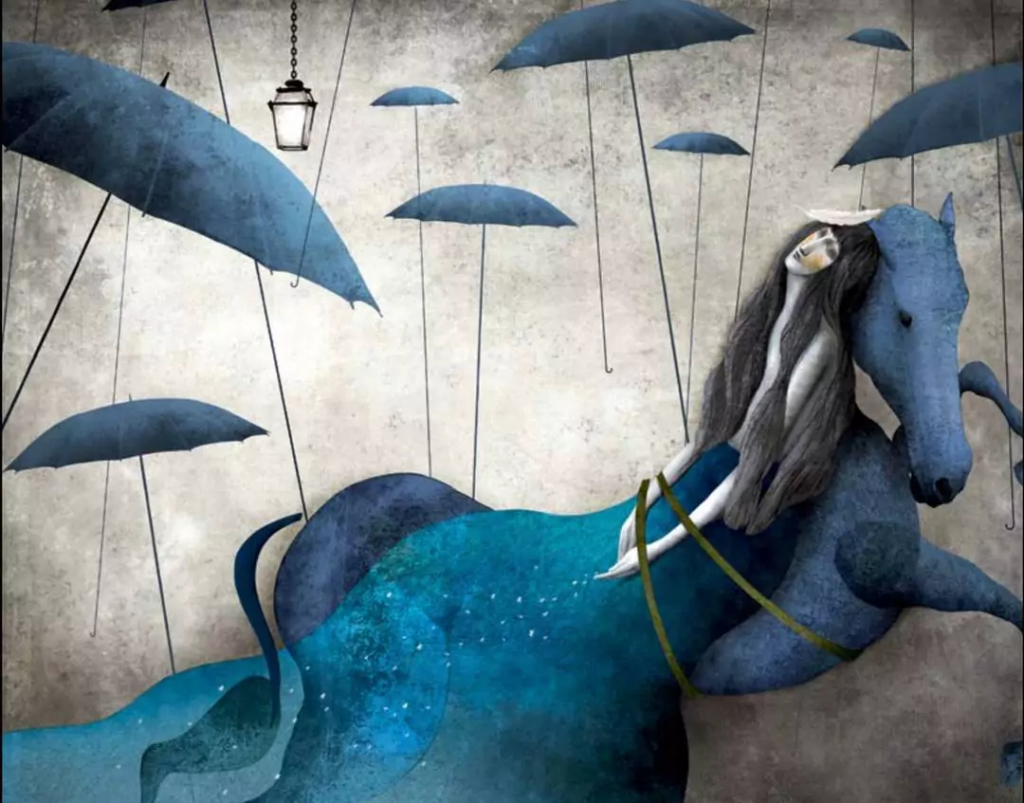 Las imágenes no se limitan a ilustrar lo narrado. Crean una atmósfera especial, poblada de elementos ¿simbólicos? que se repiten a lo largo de las páginas: paraguas, plumas, relojes de arena. Al personaje principal (y narrador) el ilustrador le ha dado unos rasgos que claramente evocan la cara inconfundible de Julio Cortázar.