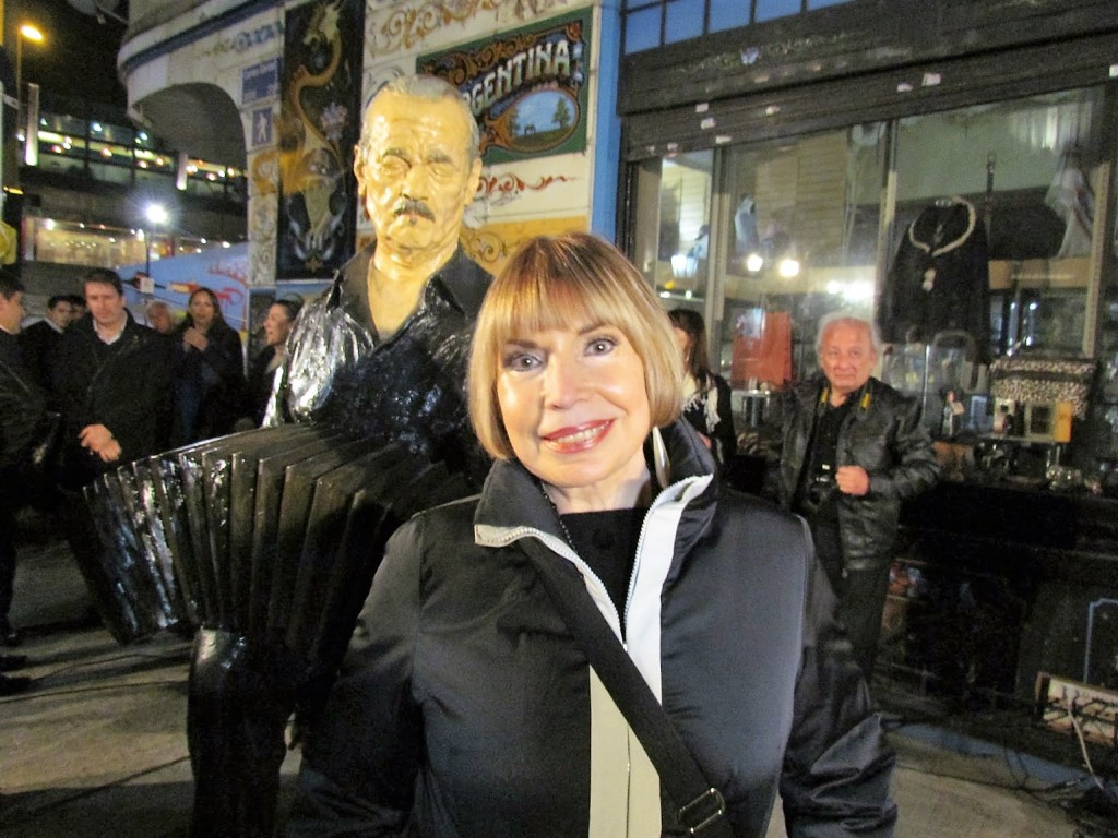Laura Escalada junto a un busto de Astor Piazzolla en el Pasaje del Tango, en el Abasto porteño. Foto: Lila Oliva.