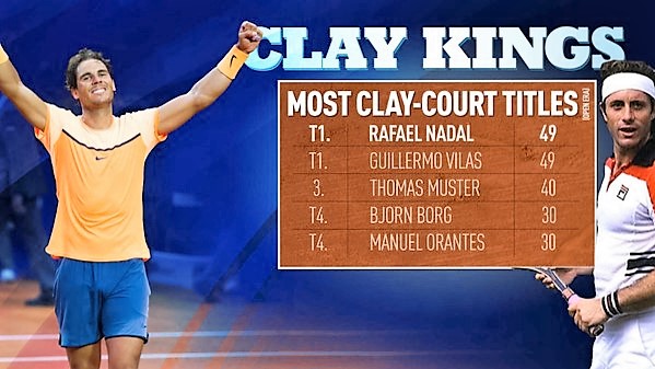 Con su triunfo frente al japonés Kei Nishikori por 6-4 y 7-5, Nadal alcanzó el record de 49 títulos en polvo de ladrillo que ostentaba Vilas desde el 24 de julio de 1983, cuando derrotó al francés Henri Leconte 7-6, 4-6 y 6-4 en Kitzbühel.