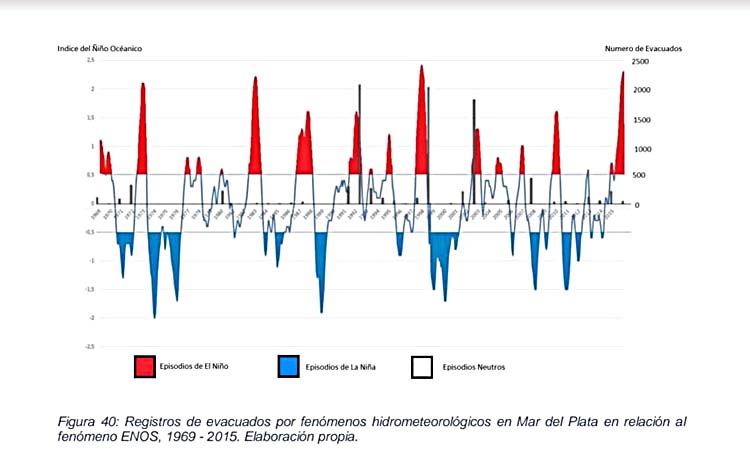 Asimismo, el estudio, que analiza el período entre 1969 y 2015, encontró que los eventos extremos ocurridos en la ciudad de Mar del Plata han tenido lugar bajo períodos del Niño, “por lo que se podría pensar en una relación entre la ocurrencia de inundaciones catastróficas relacionadas al ciclo ENOS, lo que podría el foco también en este fenómeno como una amenaza, sin quitar el análisis puesto en el foco de la vulnerabilidad, ya que es evidente que hay una tendencia al incremento de la población en condiciones de vulnerabilidad, lo que aumentaría el riesgo a sufrir inundaciones”.
