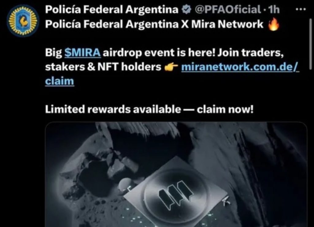 Las publicaciones mencionan: “Policía Federal Argentina Х Mira Network, Big $MIRA airdrop event is here! Join traders, stakers & NFT holders. Limited rewards available — claim now!”. Según se pudo ver se trataba de una criptomoneda con el nombre de $MIRA.